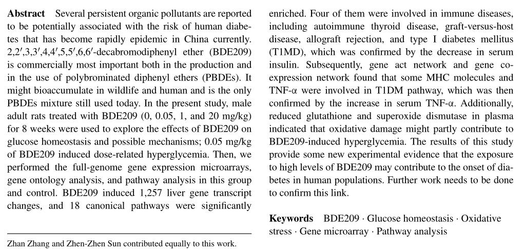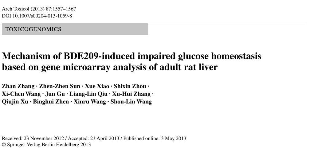 Zhang Z, et al. Mechanism of BDE209‑induced impaired glucose homeostasis based on gene microarray analysis of adult rat liver. Arch Toxicol. 2013 Aug;87(8):1557-67. (IF=5.2)