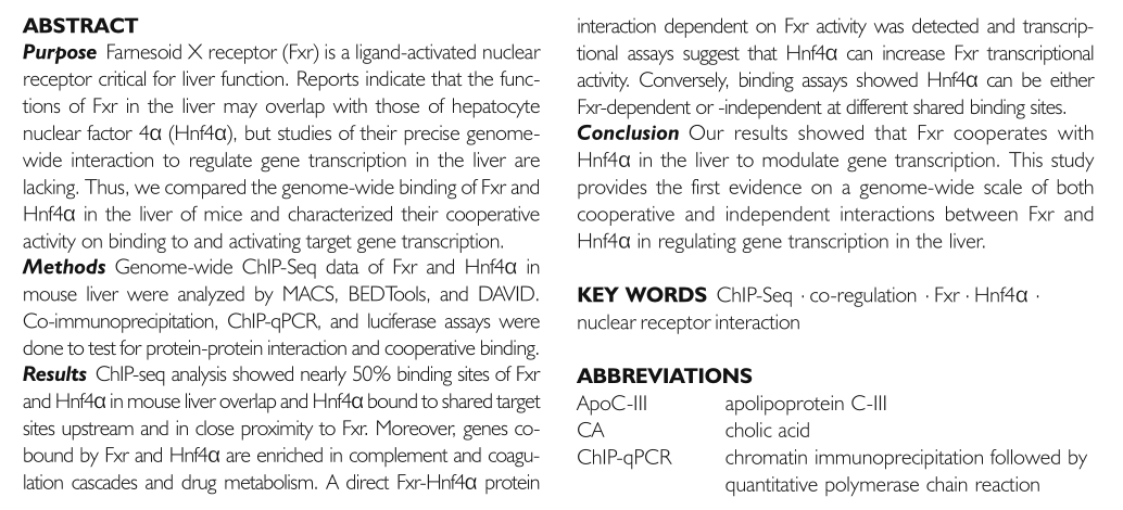 Thomas A, et al. Hepatocyte Nuclear Factor 4 Alpha and Farnesoid X Receptor Co-regulates Gene Transcription in Mouse Livers on a Genome-Wide Scale. Pharm Res. 2013 Sep;30(9):2188-98. (IF=3.952)
