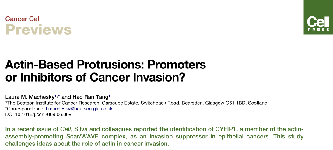Machesky LM, et al. Actin-based protrusions: promoters or inhibitors of cancer invasion? Cancer Cell. 2009 Jul 7;16(1):5-7. (IF=23.893)