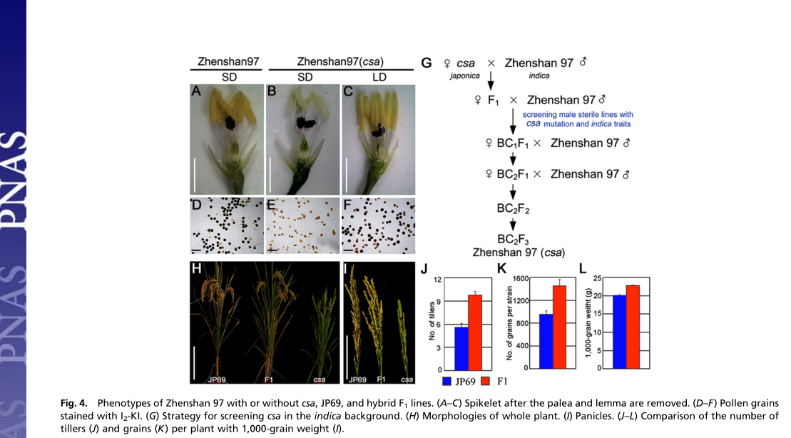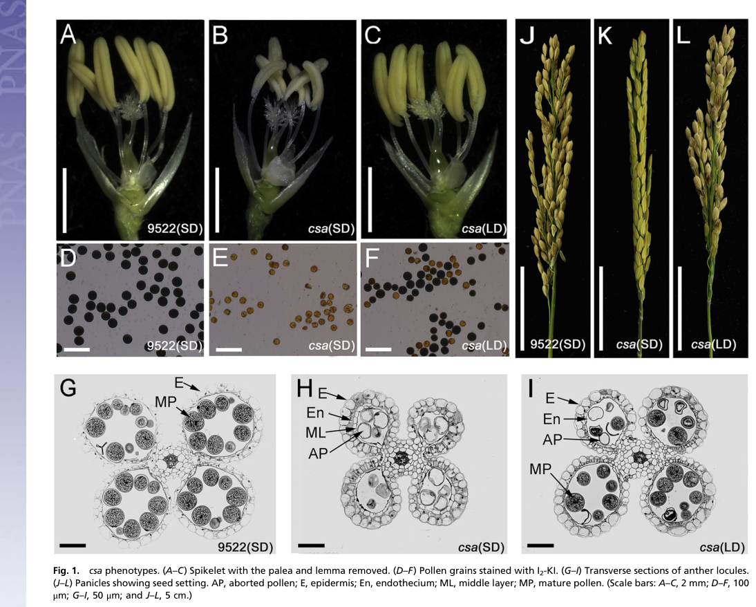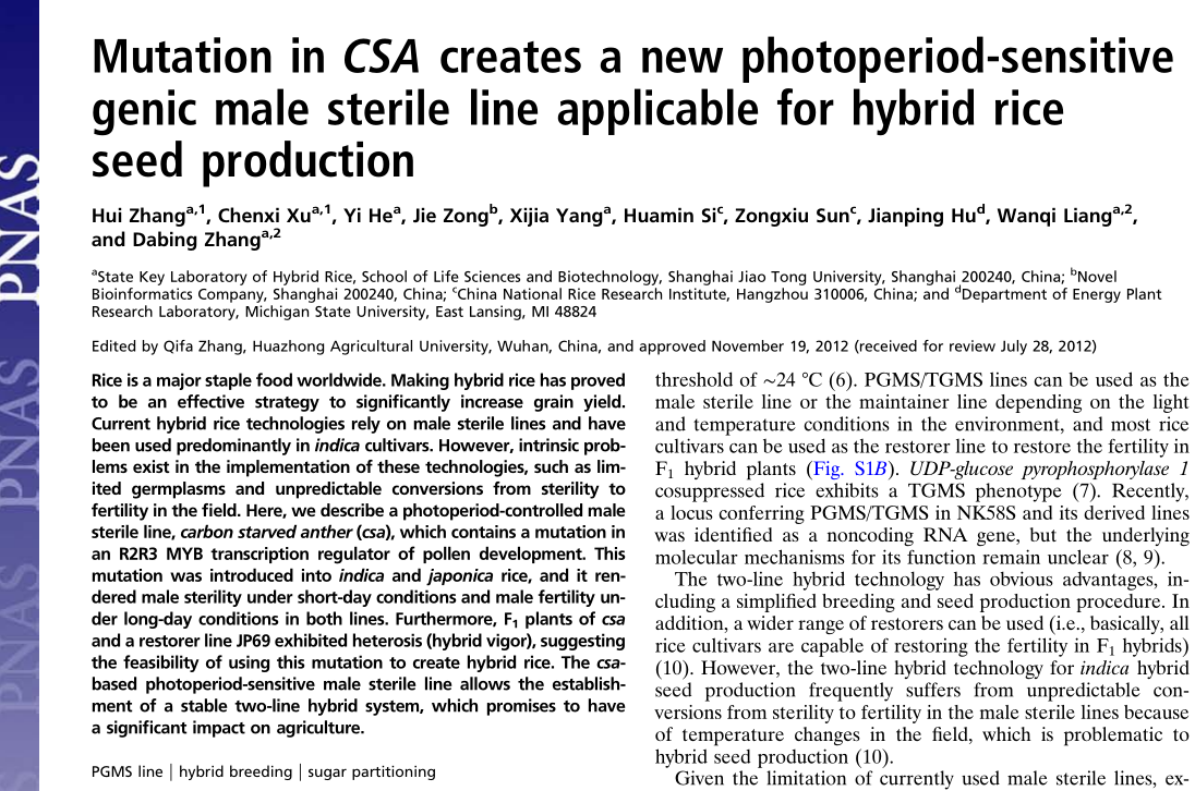 Zhang H, et al. Mutation in CSA creates a new photoperiod-sensitive genic male sterile line applicable for hybrid rice seed production. Proc Natl Acad Sci U S A. 2013 Jan 2;110(1):76-81. (IF=9.674)