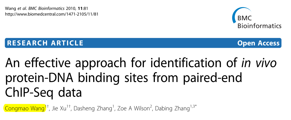 Wang C, et al. An effective approach for identification of in vivo protein-DNA binding sites from paired-end ChIP-Seq data. BMC Bioinformatics. 2010 Feb 9;11:81. (IF=3.024)