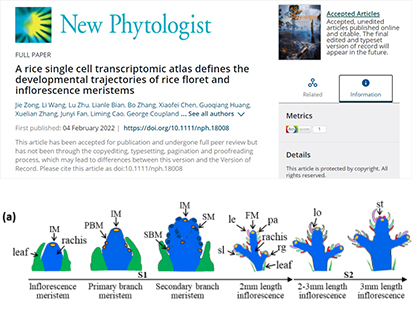 2022年2月4日,NEW PHYTOLOGIST在线发表了上海交通大学生命科学技术学院袁政教授团队和烈冰团队通力合作的水稻花序单细胞文章,对水稻花序组织中细胞的分化发育进行了全面剖析。 烈冰生物CTO宗杰博士和王丽、朱璐博士为共同第一作者,上交大袁政教授为本文章通讯作者,张大兵教授,梁婉琪
