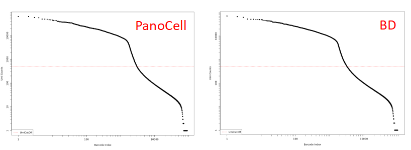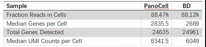 ②Mean Reads per Cell:均在45K reads以上,符合单细胞数据分析标准,其中PanoCell :48.5k reads per cell,BD:45.18k reads per cell;