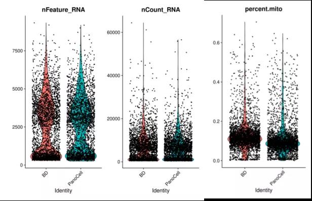 ①捕获细胞数量:两个样本分别捕获2944个细胞(PanoCell)和3145个细胞(BD);