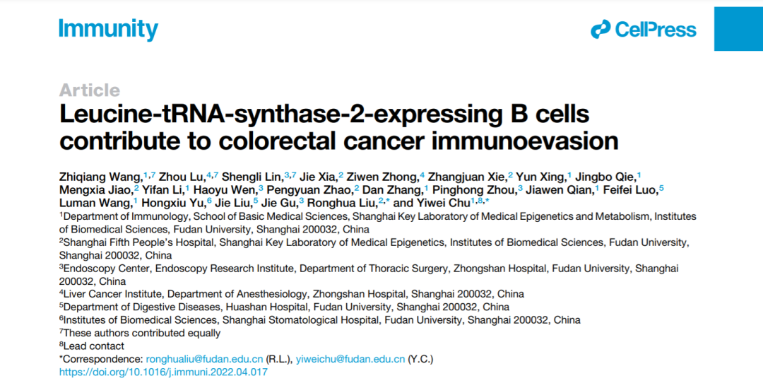 Immunity杂志上发表了新的观点:某些B细胞竟沦为CRC免疫逃逸的帮凶... 本研究由复旦大学基础医学院及生物医学研究院以微刘荣花研究员团队合作,文章于2022年6月3日发表在Immunity杂志(IF=43.474